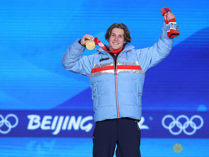 220209 Birk Ruud Of Norway With His Gold Medal At The Medal Ceremony For Men S Freeskiing Big Air During